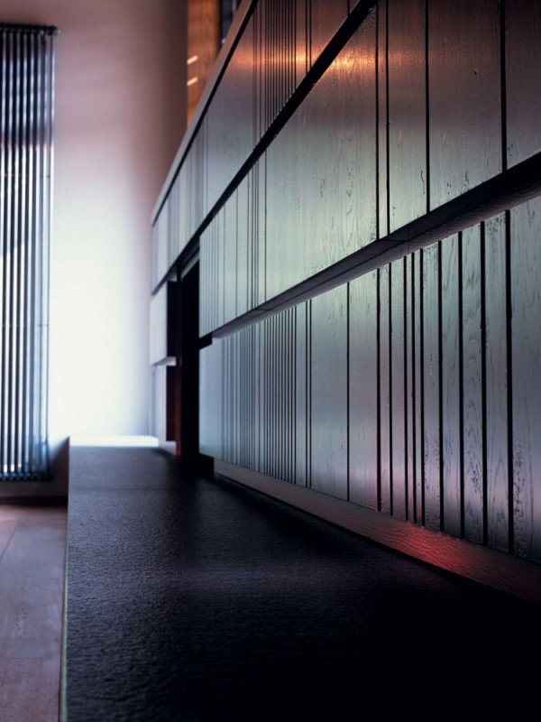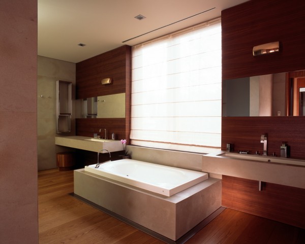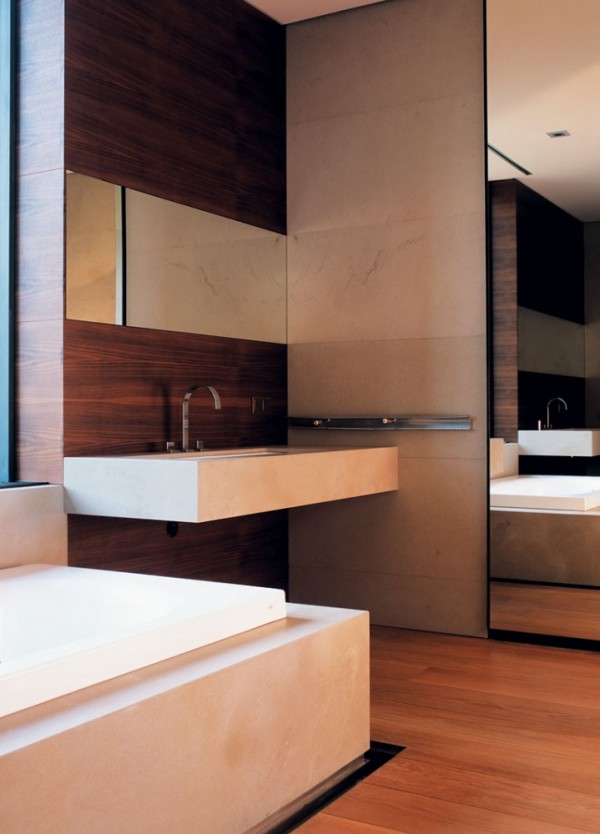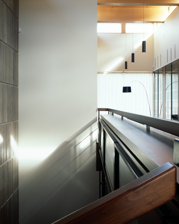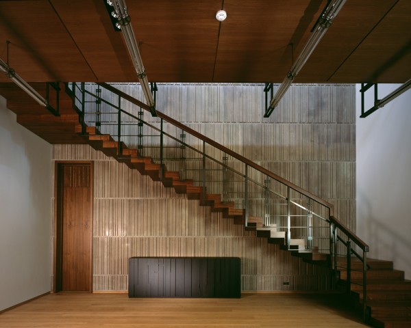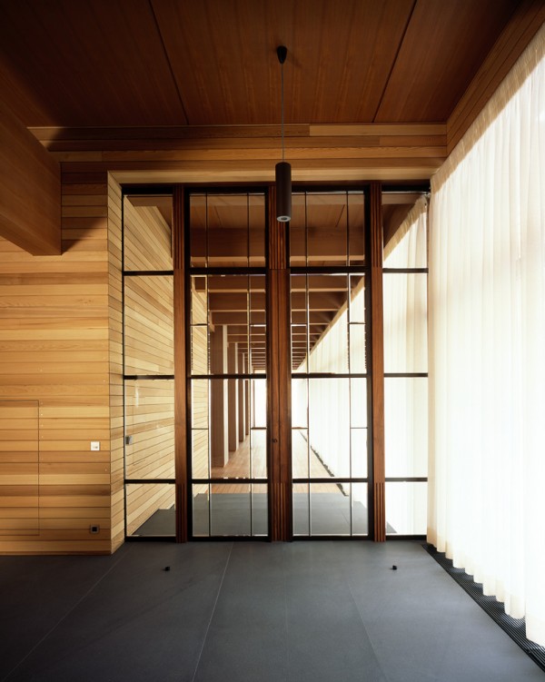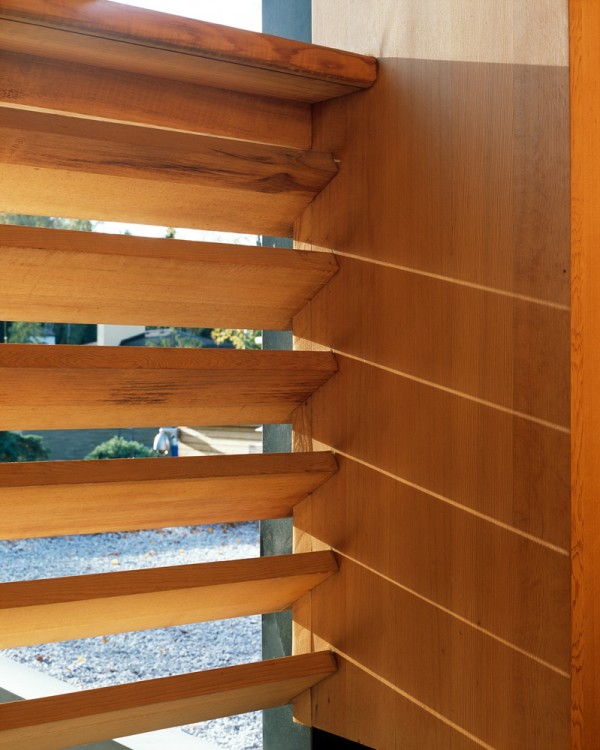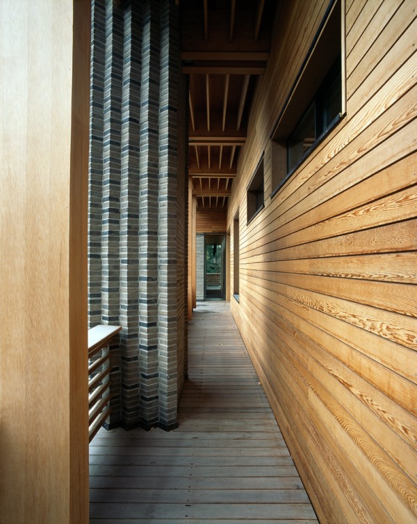 The exterior design is covered in brick and lath wood finish and interrupted by some strong vertical accents. The facade is quite elegant due to its elements positioned in a vertical direction, that allows the light to pass inside. The house has a simple structure, the right wing is a swimming pool and winter garden, while the left wing is a stand alone dwelling unit with living room, bedroom and bathroom.