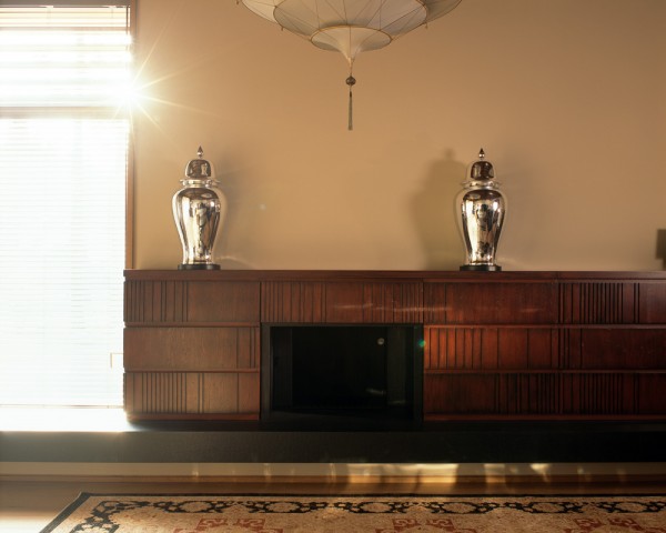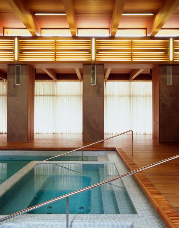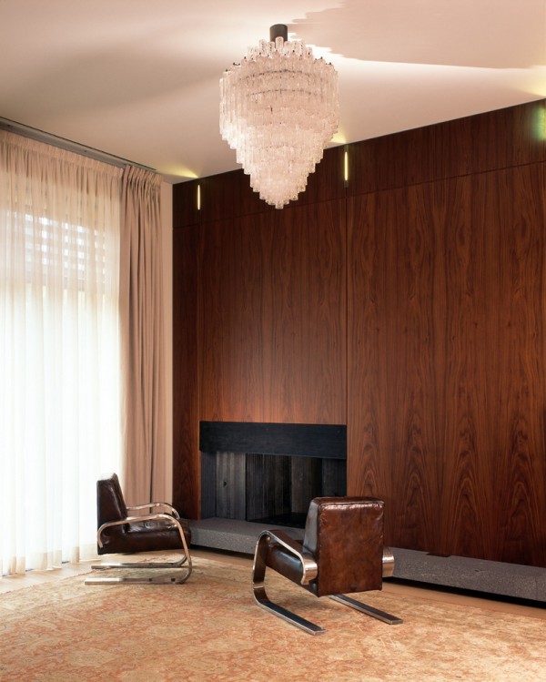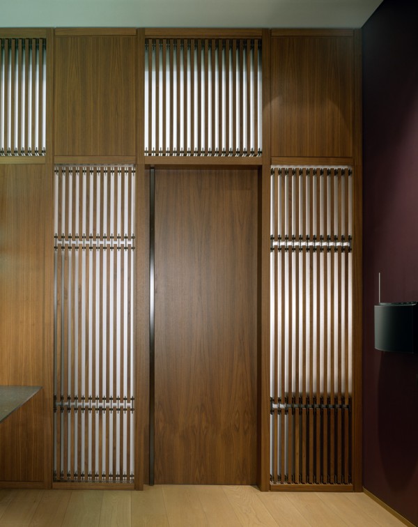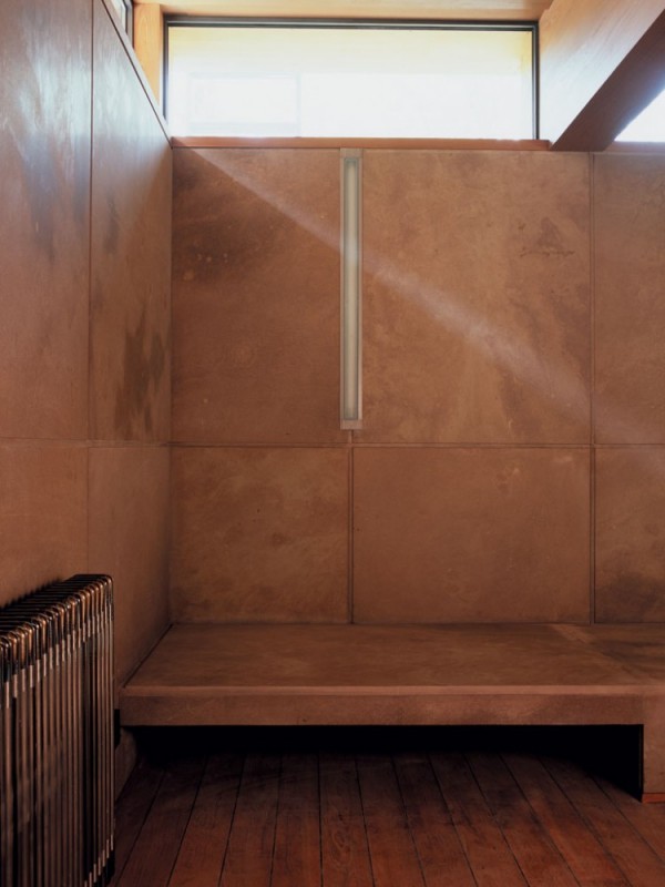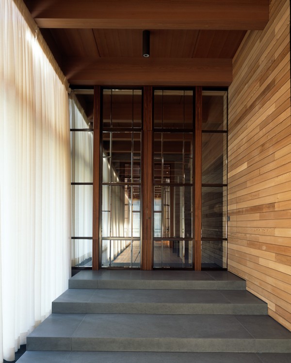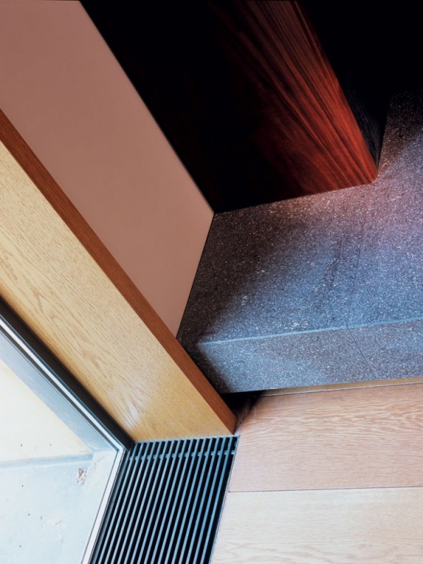 The exterior design is covered in brick and lath wood finish and interrupted by some strong vertical accents. The facade is quite elegant due to its elements positioned in a vertical direction, that allows the light to pass inside. The house has a simple structure, the right wing is a swimming pool and winter garden, while the left wing is a stand alone dwelling unit with living room, bedroom and bathroom.