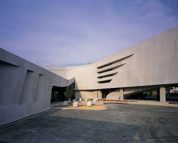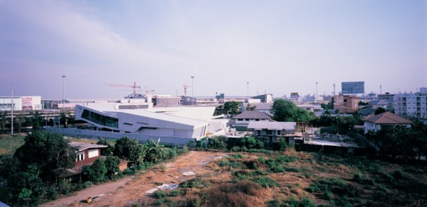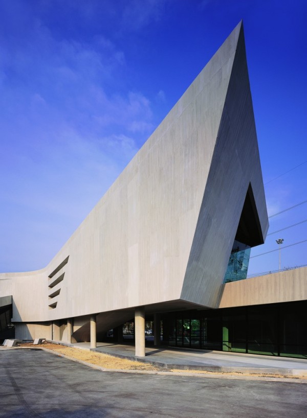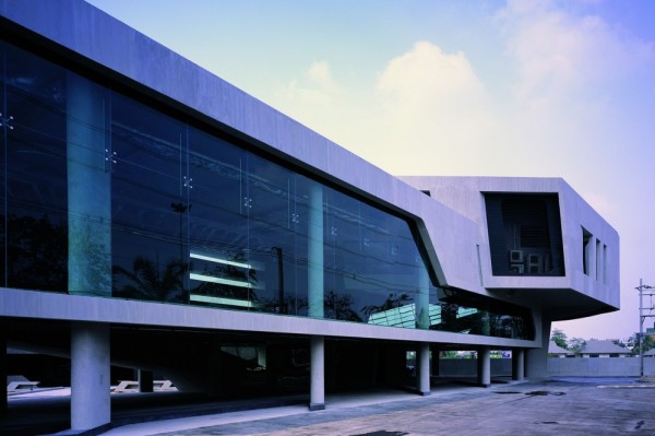 In 2009 VaSLab Architecture designed the Honda Big Wing located on Praditmanutham Road in Ladprao, Bangkok, Thailand. It reminds of the winning moments of racing motorcycles. Made by concrete the sculpture’s forms are in “hugging the curve” transition. The café from the ground level, the showroom, retails, education zone from the first level and the warehouse are united by a boomerang façade. There are two of these that combines the plans, the other one takes from the mezzanine lounge/conference to the offices, canteen and back to the ground level with the service center and workshop.