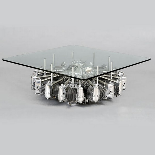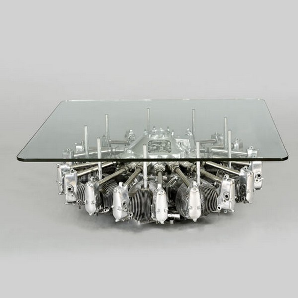 Cylinder Radial Engine Table is a coffee table with an odd, yet cool design. Its base is a genuine plane engine from a US Army Boeing-Stearman PT-13 aquired from the Canadian Museum of Flight, Langley, British Columbia. Even if the old engine creates a mechanical, vintage aspect, its total look is contemporary. The contrast between the rough material and aspect of the engine and the fragile glass creates an impressive look. Just putting together, in the same sentence the words old plane engine and coffee table already sounds weird, even if seeing them like this gives a good impression. If you have a passion for planes this table can become your favorite furniture piece in the house. It also goes well as a present for some who has this passion or he/she just loves modern objects.