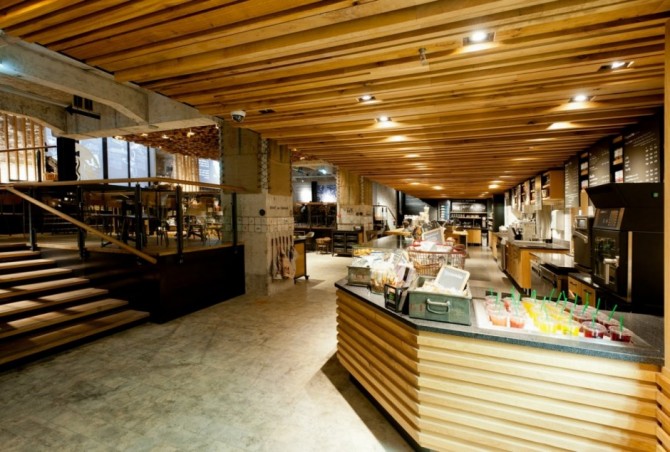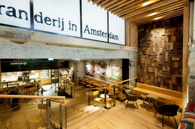 On a 430 square meter subterranean area was placed the laboratory, it is the first store that was named “laboratory”. It is an innovation and an experimentation inspired by contemporary Dutch culture. The designer Dutch-born Liz Muller and another 35 artists and craftsmen created quirky local design touches and they integrated the repurposed design. Elements like Delft tiles, walls clad in bicycle inner tubes, wooden gingerbread biscuit moulds and coffee bag burlap, the “Delftware” mural create a strong connection with the local concepts. There were necessary 1,876 pieces of individually-cut blocks to make the undulating ceiling relief. This and the benches, the tables were made by Dutch oak. Because before the store there was a historic bank on the popular Rembrandtplein its architecture was respected but still the coffee is seen as a theater.