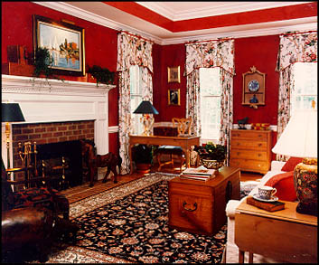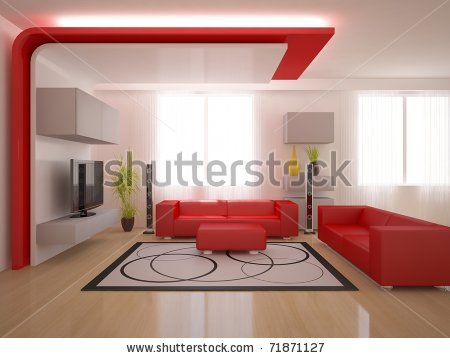 Another red living room, but combined with blue-grey. A very cozy room, for long winter evenings. Blue is a cold color, but in combination with red the coldness disappears and the atmosphere becomes warm and tender. Red and white curtains refresh the room, the grey and modern designed chairs stimulate the atmosphere of work, too. It is a useful combination between an office and a living room. But the red coach invites you to take an afternoon nap.
