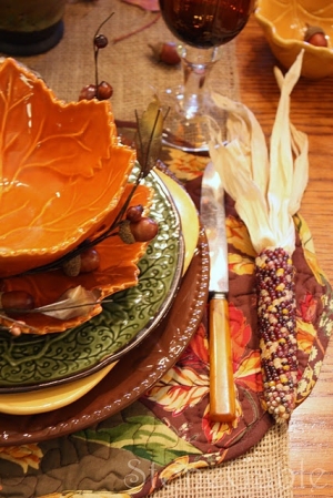 Here you may enjoy a detail from a table set for an autumn cold evening. The light is mild, in autumnal colors. There is a table cloth in the corn color. There are ceramics brown, orange or green plates (some of them like leaves), cobs as adornments and glasses full with red autumn wine. A real table of abundance!