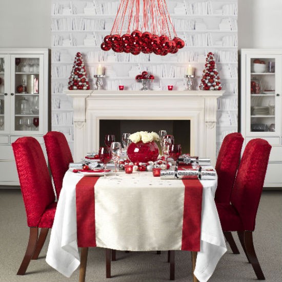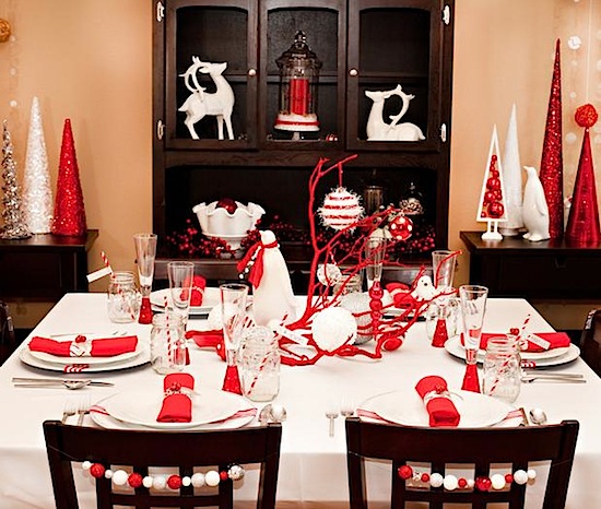 I could set the table near the fireplace, in a white décor, combined with red chairs, red ribbons and an impressive red globes chandelier, which has the same visual effect as a fir tree. Or, in the same white and red disposition, I could set the table in a black and elegant table cloth and I enlighten the atmosphere by placing red and white napkins, crystal glasses and red and silver little fir trees mingled among the cutlery.