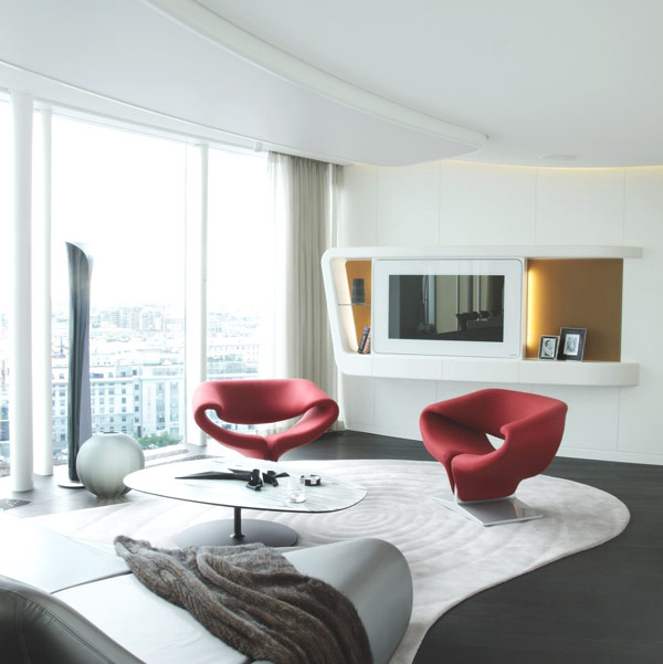 Elegant furniture, leather in combination with soft textures, curved lines for sweeten the atmosphere, original pieces of furniture and décor elements, amazing panorama over the whole city, nice and luxurious kitchen, shining and bright, soft carpets, waving on the floors and inducing peace, relaxation and comfort, are the main elements characterizing this splendid triplex. There are rooms with a masculine touch and rooms with a feminine touch, but the perspective is the same.