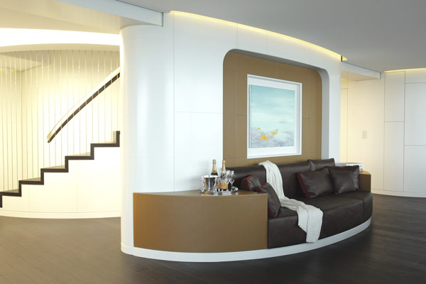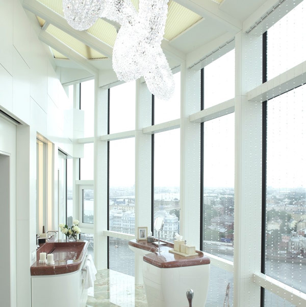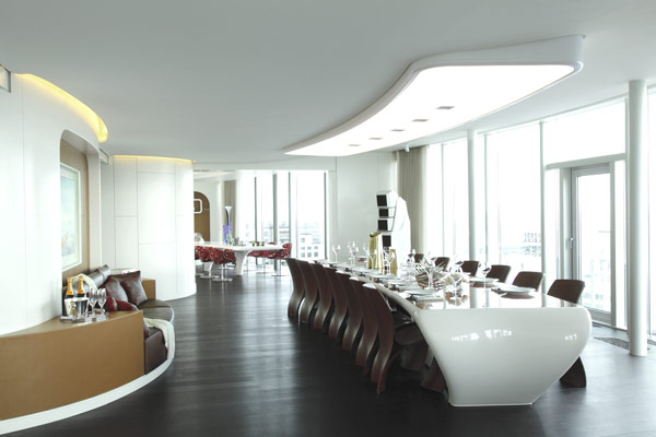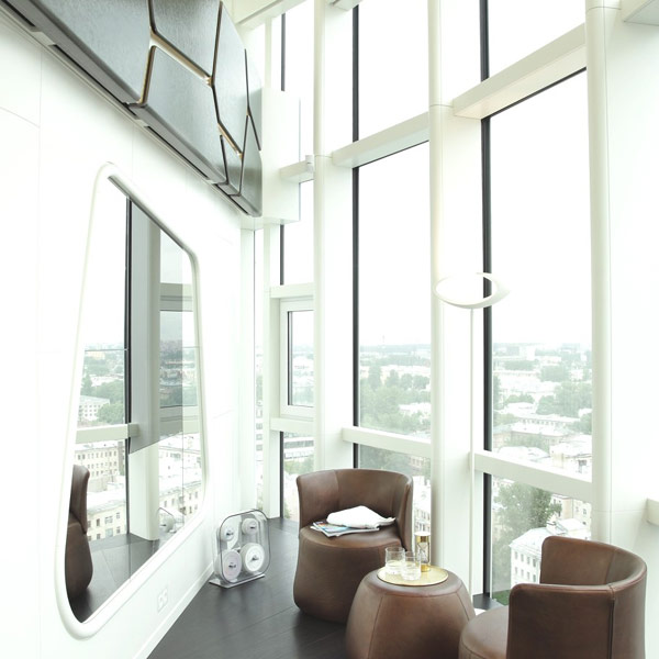 Two terraces located on the upper two levels allow the inhabitants to enjoy panoramic views of the city center and large windows flood the rooms in natural light. The three levels of the penthouse are connected by interesting stairs. There are spaces for retreat and relaxation everywhere, even on the halls, by the large windows, and the bottom floor accommodates both living and private spaces, creating a loft-like experience. One of the three levels is hosting spaces for entertaining and business facilities and on the third floor you will find an impressive space delimited by glass, with a large perspective over the city views and modern elegant furniture. The apartment seen as a whole is entirely elegant and luxurious.