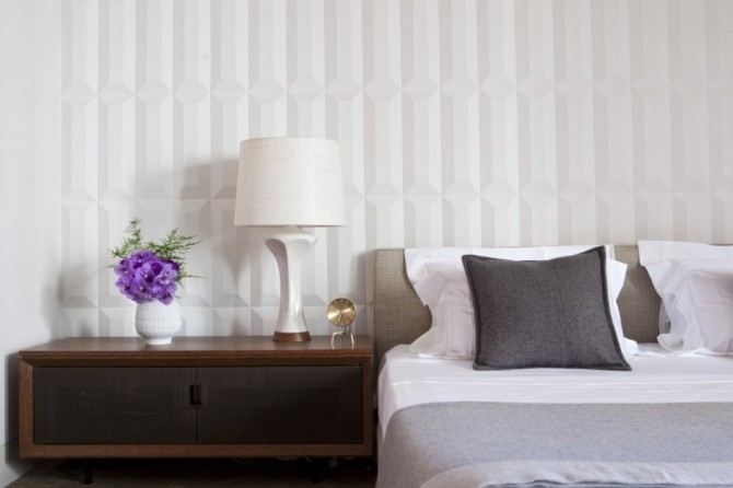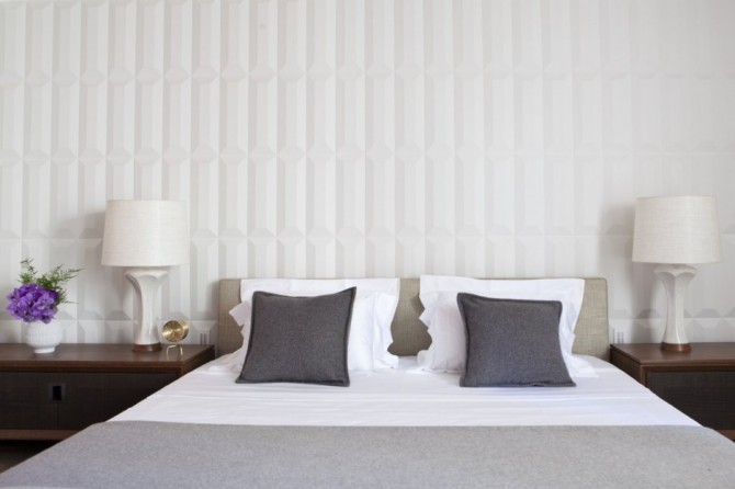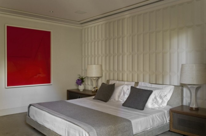 The bedroom respects the same simple but elegant manner of design. Decorated in white and grey nuances, it presents a red picture hanging on a wall, creating a contrast with the rest of the room and adding personality.