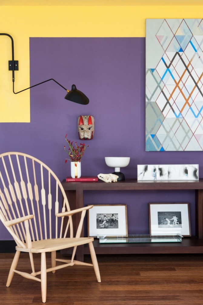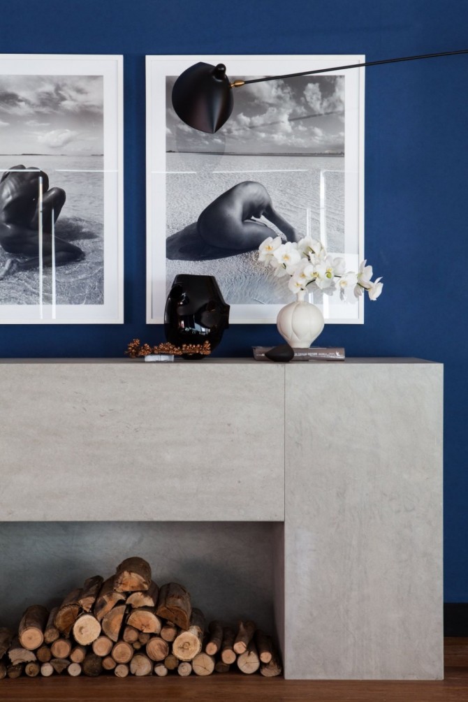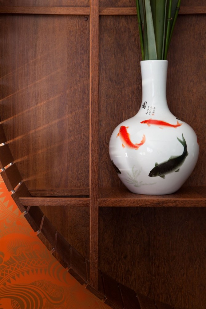 The space reminds us a big origami; you can find different objects associated in different contexts, creating an interesting amalgam. Bamboo furniture, lacquer and hardwood, traditional references to China flow over the high-tech bamboo floor and contrast with the extravagant wallpaper printed with stylized golden dragons. The crystal chandelier from the traditional brand Saint Louis is hanging over a wooden table, a huge rough linen sofa placed in front of a nice fireplace made of exotic granite, modern photos on the walls, exotic orchards, wooden benches and chairs and vivid colored walls, the picture of a black pig together with a landscape sketched in pencil, are together mixed in this amalgam of cultures and traditions, creating an amazing and provocative atmosphere.