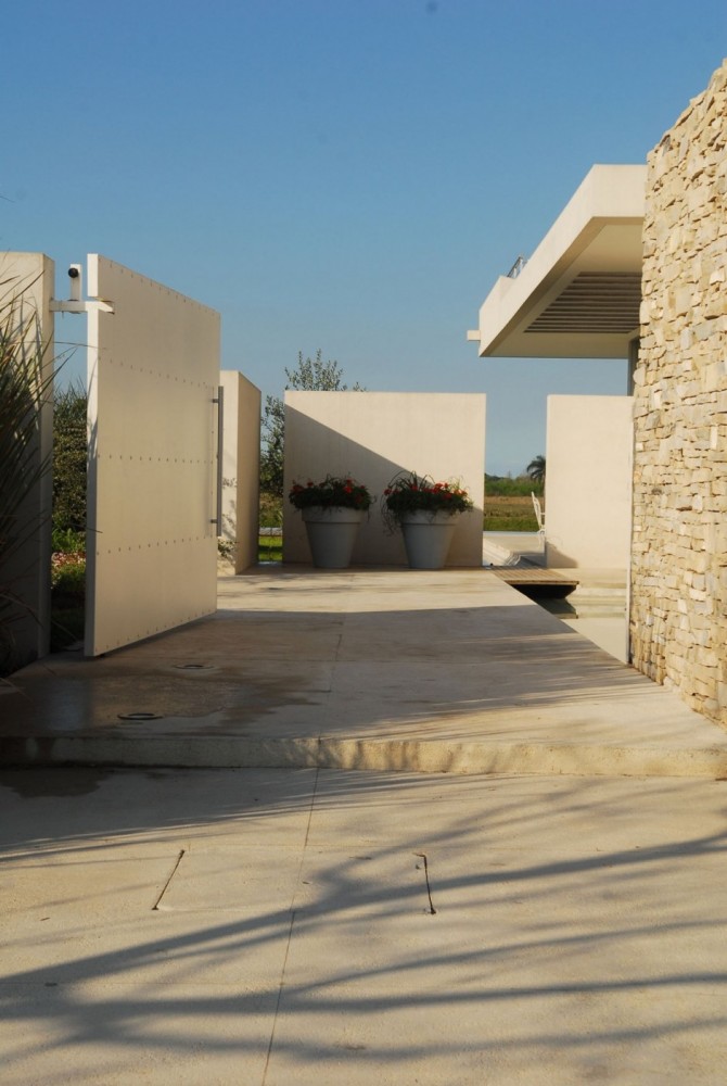 The first floor accommodates the master bedroom and other small bedrooms for guests. The design of the entire house is based on two stone walls, the color of the stone being the origin of the entire color palette of the house. The residence is luminous and exotic like a delicate flower, opening its white petals in the sun, reflecting its image in the swimming pool like in a mirror. The green lawn surrounding it borrows its green sparkling to the water and the image is perfect. The living space is large and airy, with floor to ceiling windows allowing seeing a splendid view over the landscape.