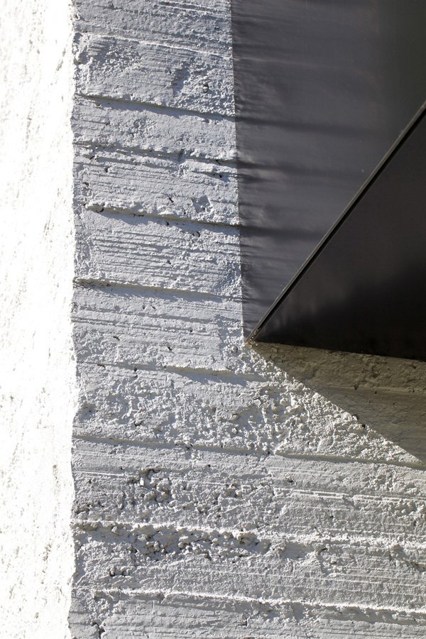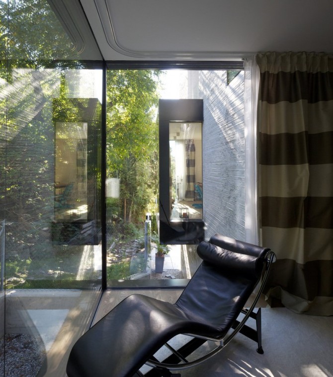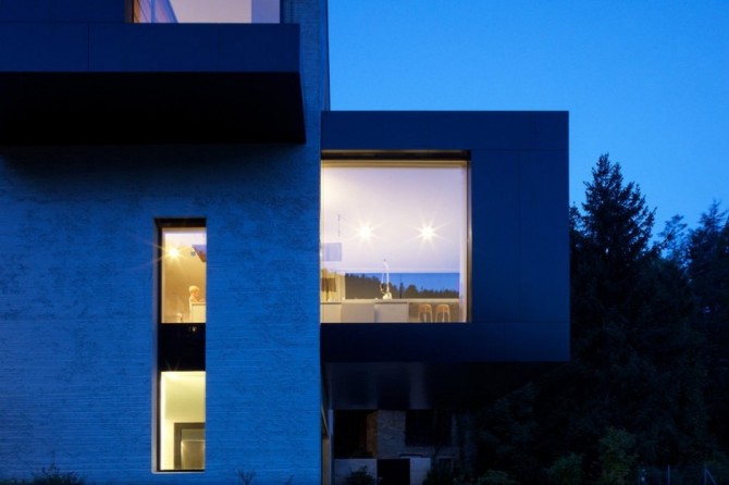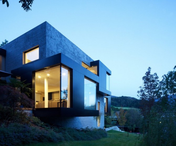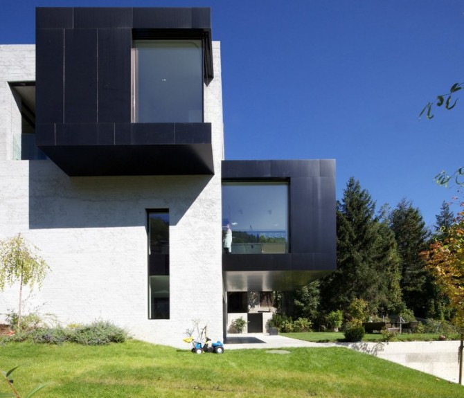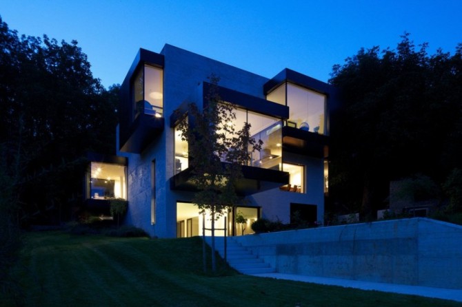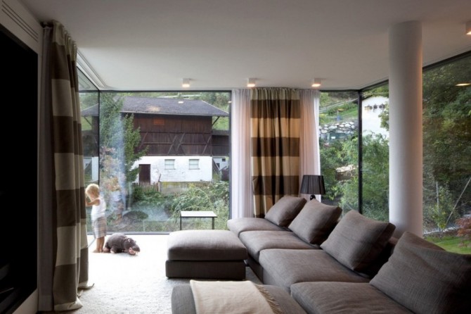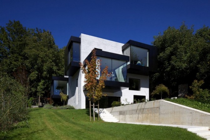 It is built-in concrete, surrounded by a beautiful green wood, enjoying the splendid view through its large floor to ceiling glass walls which allows light to flood the inner space. The living space, surrounded by glass walls, looks like a shop-window, making you feel in a permanent connection to nature and displaying the child and the dog like a delicate flower exposes its pestle by opening its petals. It looks serene and beautiful! You can admire the entire landscape from the windows, having the feeling that you are outside, in the middle of life. There is so much light that you need to be protected by solid carpets, assuring you the privacy you need.