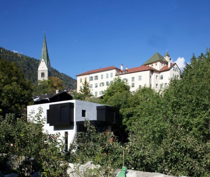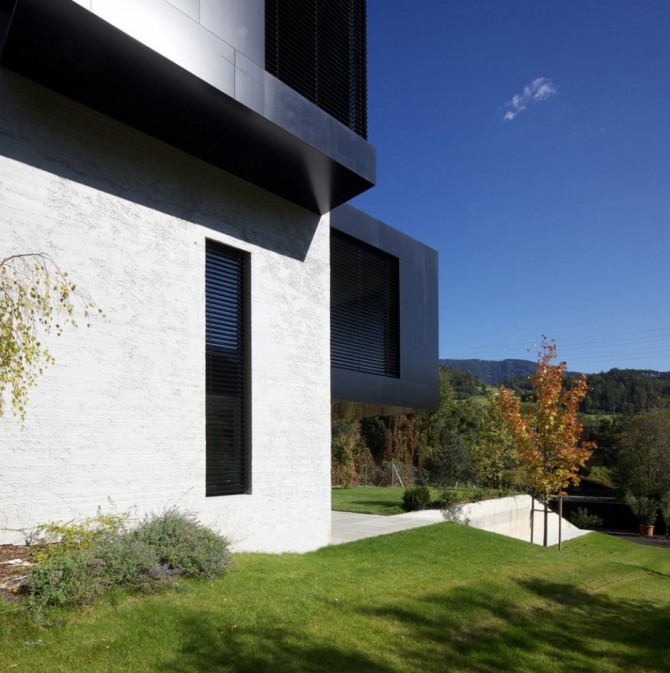House P is designed by Bergmeisterwolf Architects and it is located in Mühlbach, Italy. Painted in white, the house dresses the colors of the night, or of the evening, or of the sunny days, in a continuous attempt to appear always new.