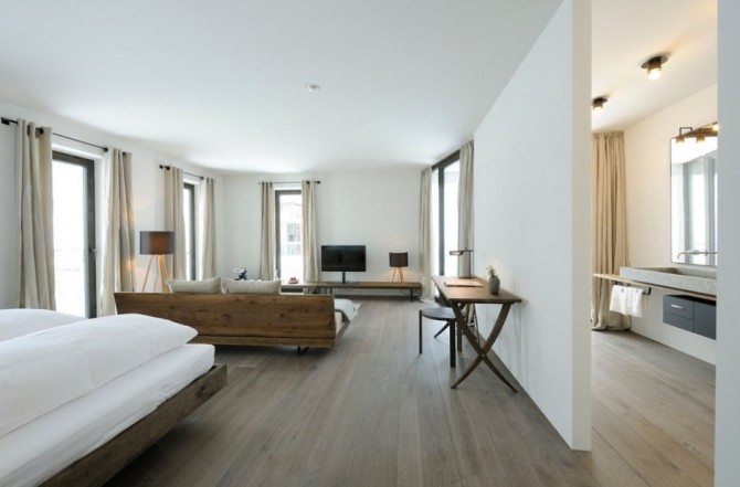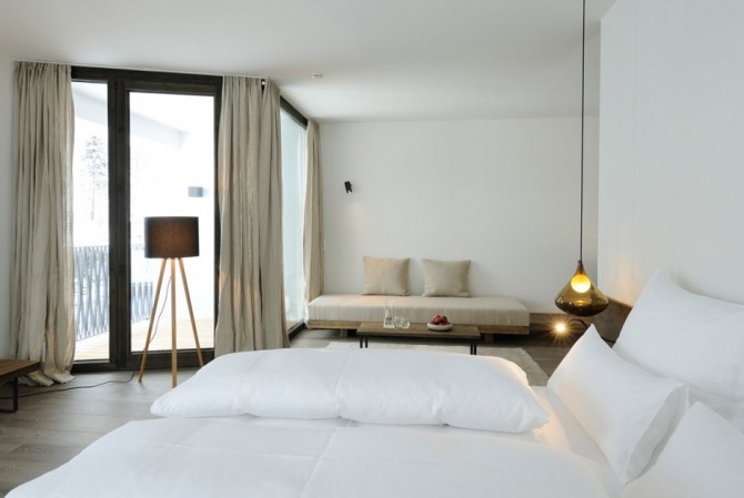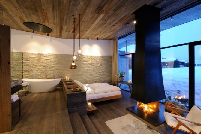 They are simple furniture, with large windows, allowing you to enjoy the beautiful snow from outside, a bathtub is installed behind the bed; there are no walls to separate the bathroom from the bedroom, so the coziness is increased.  The house wakes up a richness of impressions, connecting you to nature in the same time.