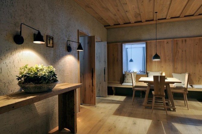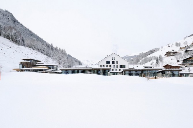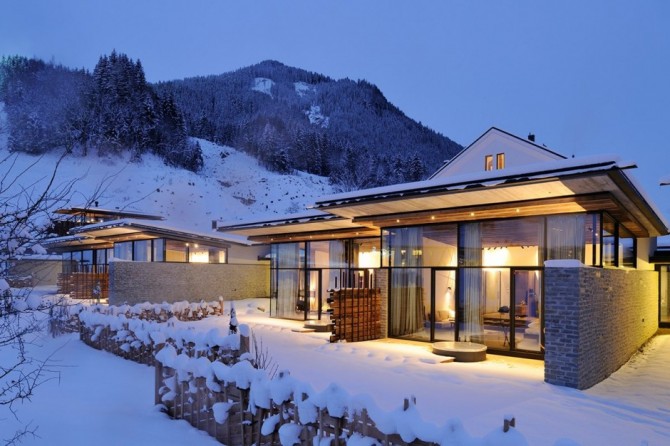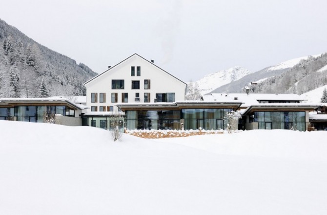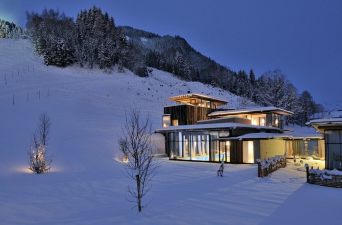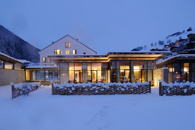 Wiesergut Hotel is designed by Gogl&Partners Architekten and it is located in the valley of Hinterglemm, Austria. As seen from outside, the building looks at night like a huge fir-tree adorned on the top of the highest mountains. With its lights, it makes the snow surrounding sparkling. The hotel has the appearance of a cozy chalet, offering the warm feeling of a fireplace in winter.