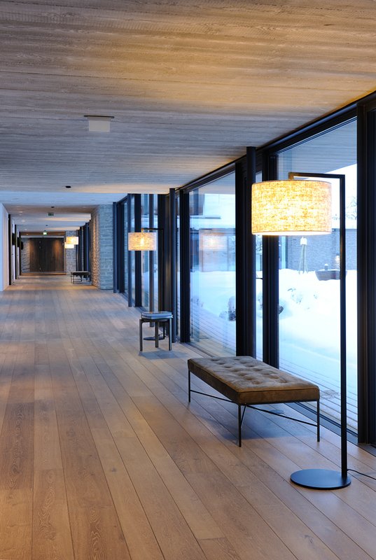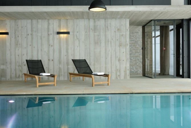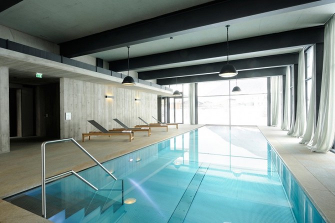 The main entrance to the living space has glass sliding doors, reflecting the snow and bringing a bit of winter inside, by the warmth of the fireplace. Elegant, white and cozy, the living room continues with the kitchen, inviting you to feel like home. Wooden floors and furniture, intimate spot lights and chandeliers, contribute to increase its intimacy. A large swimming pool, surrounded by glass walls, offers the impression of swimming in warm waters among cold snows. Intimate tables are set to offer privacy and the bedrooms are the definition of intimacy.