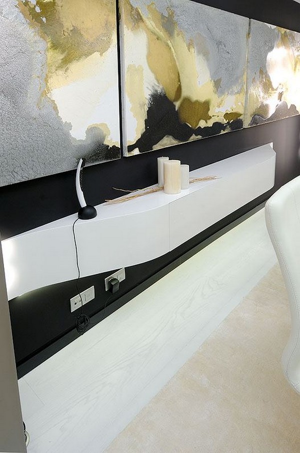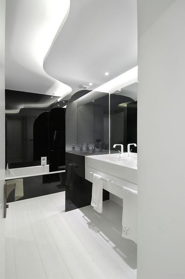 In all of the rooms, the white color predominates and is accentuated by the use of some minimalist elements such as a lacquered black wood console, and there’s also a lot of lacquered black used on the ceiling. In a few rooms, the monochromia is break by some pale velvet champagne tones.